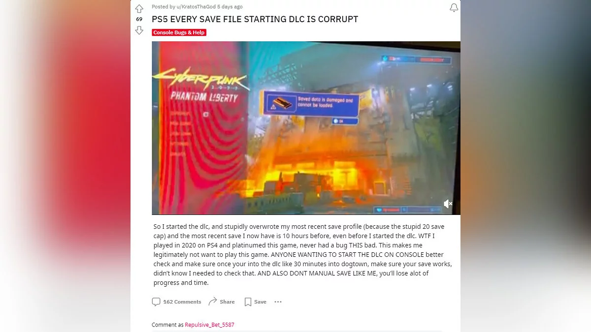 Обладатели версии DLC для консоли PS5 жалуются, что после игры в дополнение они не могут запустить своё последнее сохранение — появляется сообщение, что оно повреждено. Студия CD Projekt RED сообщила, что знает о проблеме и уже пытается исправить её. Разработчики посоветовали игрокам не перезаписывать старые сохранения и подождать патча.