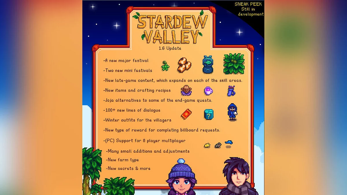 На прошлой неделе разработчик игры Stardew Valley под ником ConcernedApe опубликовал статью, в которой рассказал, что ждёт игроков в грядущем обновлении. К статье была прикреплена картинка с информацией о обновлении 1.6.