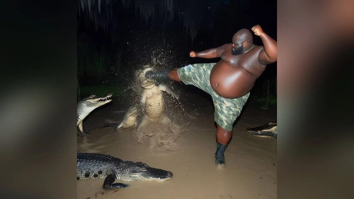 В сети завирусилось изображение, на котором мужчина дерется с аллигатором за пиццу. Оно уже собрало миллионы просмотров -