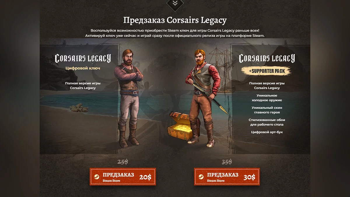 Стандартное издание Corsairs Legacy стоит $20, а расширенное — $30. В состав последнего входит набор Supporter Pack с уникальным оружием, скином для главного героя, обоями и артбуком.