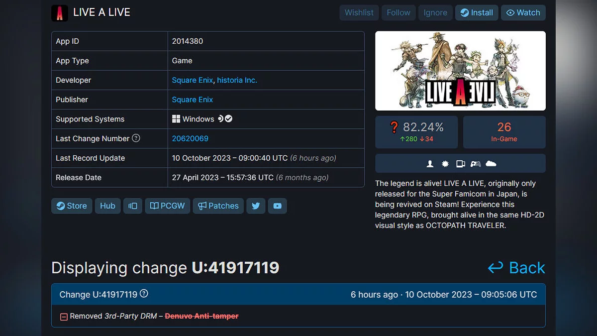 Благодаря сервису SteamDB стало известно, что ещё одна ПК-игра Square Enix лишилась Denuvo. На этот раз защиту убрали из Live A Live, ремейка старой японской RPG, вышедшего 27 апреля.