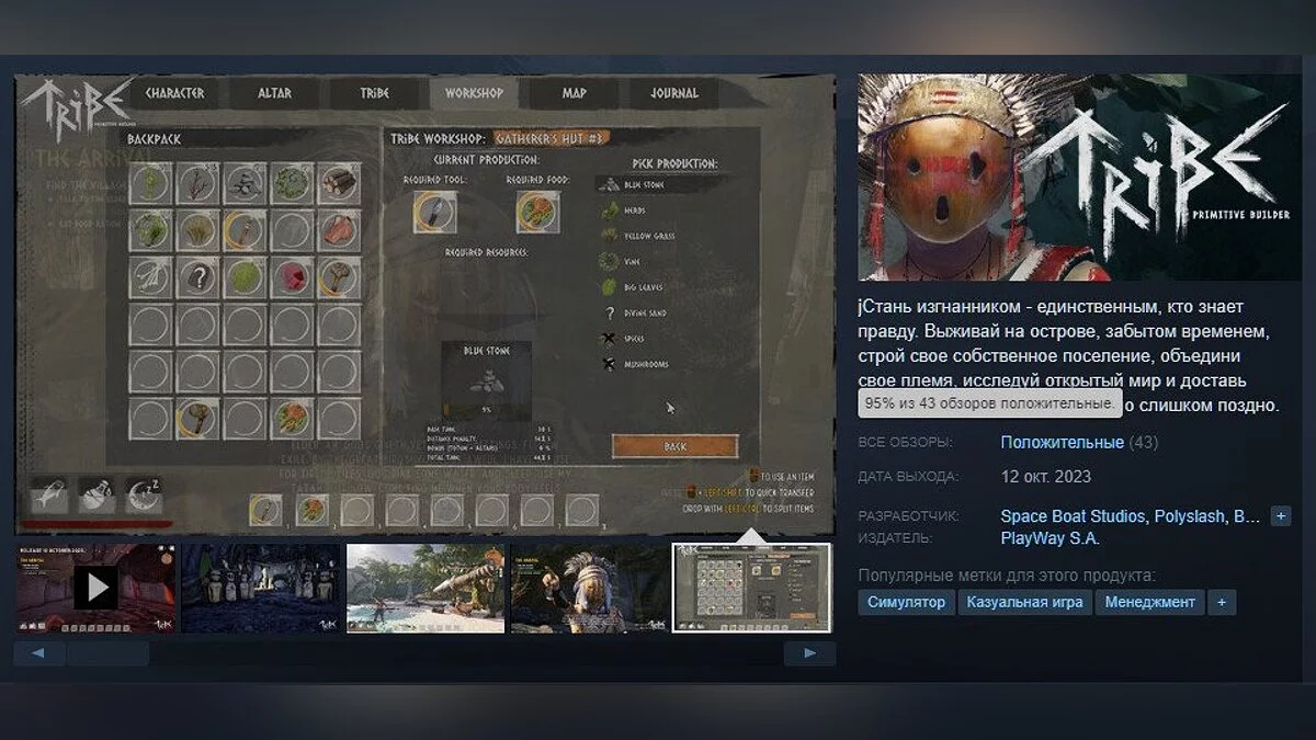 Студия Polyslash совместно с издателем PlayWay S.A. выпустила выживач в открытом мире Tribe: Primitive Builder. Игрокам достанется роль первобытного архитектора, который должен построить деревню и привести народ к процветанию.