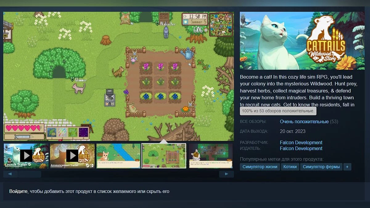 Независимая студия Falcon Development выпустила в Steam «ламповую» ролевую игру Cattails: Wildwood Story, представляющую собой полноценный симулятор кота. За сутки проект получил десятки положительных отзывов. Сейчас его рейтинг составляет 100%.