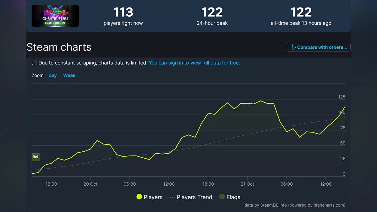 Ghostbusters: Spirits Unleashed не смогла привлечь внимание геймеров — в пике онлайна в игре находились 122 человека. Проект получил 35 отзывов — 80% из них оказались положительными.