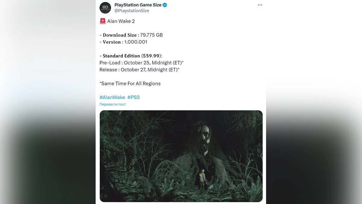 Аккаунт PlayStation Game Size в X (Twitter) раскрыл размер Alan Wake 2 на PlayStation 5. Версия для консоли Sony займёт 79,7 Гб свободного места. Вероятно, с патчами игра будет весить больше. Размер версии для компьютеров, судя по недавно опубликованным системные требованиям, равен 90 Гб.