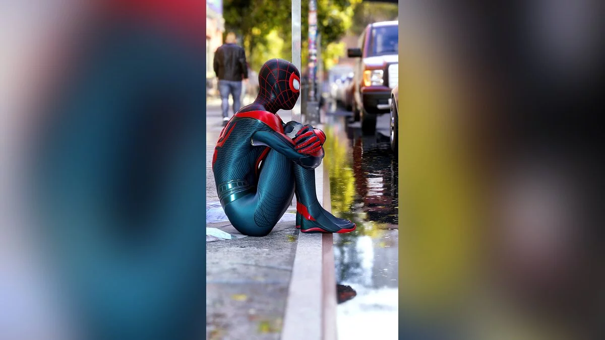 На снимке изображен Майлз Моралес сидящий напротив лужи. Благодаря реалистичным отражениям создается впечатление, будто кто-то просто вышел на улицу и закосплеил любимого героя.