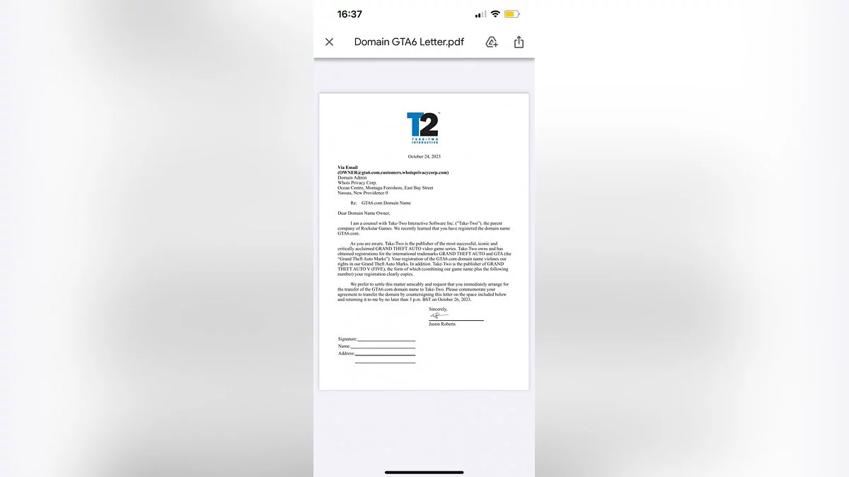 Похоже, Rockstar действительно готовится к скорому анонсу Grand Theft Auto 6. В сеть утекло предполагаемое письмо Take-Two Interactive, адресованное владельцу домена GTA6.com. В сообщении юристы компании просят передать права на доменное имя до 26 октября.