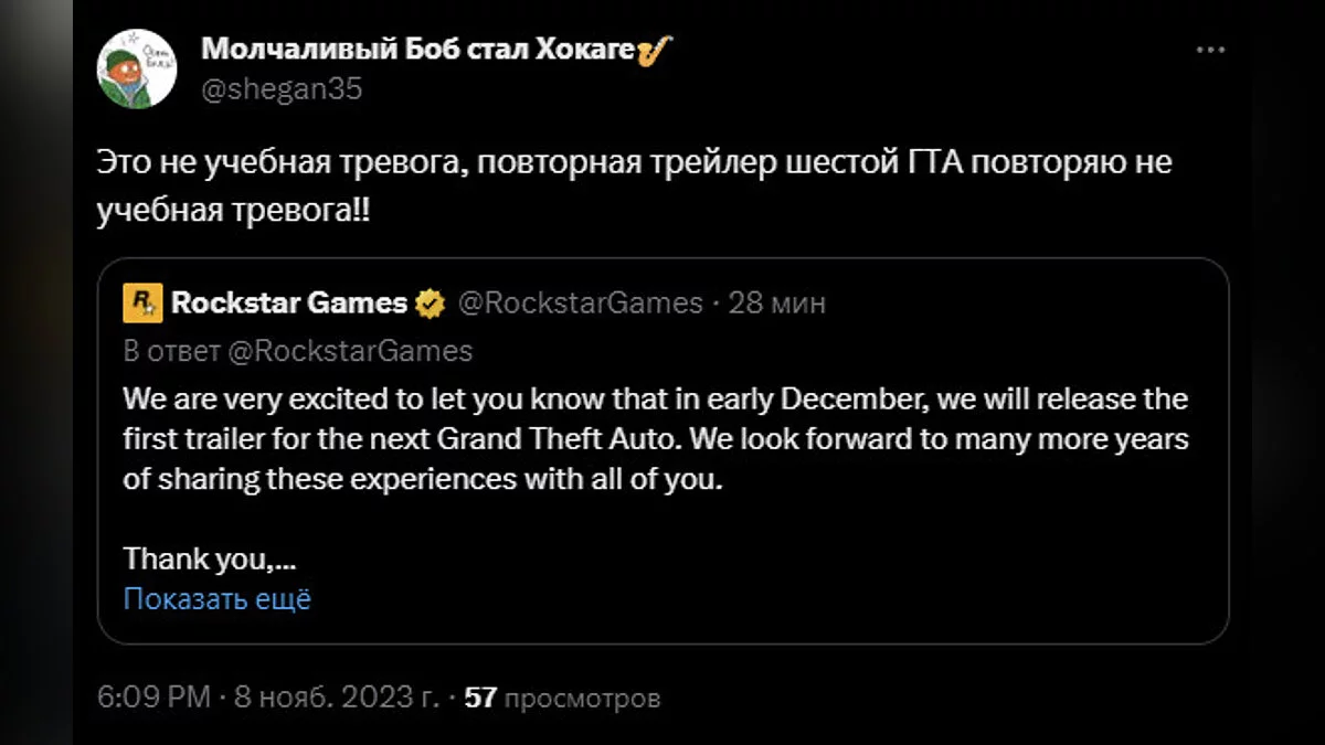 Как и следовало ожидать, анонс дебютного трейлера GTA 6 буквально разорвал соцсети. Всего за 20 минут официальный пост в X (Twitter) набрал 3 миллиона просмотров и десятки тысяч лайков. Фанаты тут же поспешили поделиться своими впечатлениями от анонса, а мы — собрать самые интересные из них.