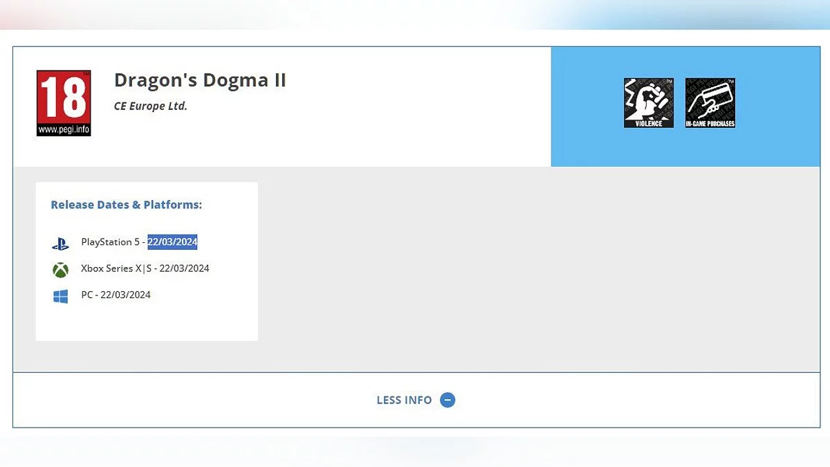 Похоже, в сеть просочилась точная дата выхода Dragon's Dogma 2, фэнтезийного ролевого экшена от Capcom. Согласно странице игры на сайте рейтингового агентства PEGI, релиз состоится 22 марта.