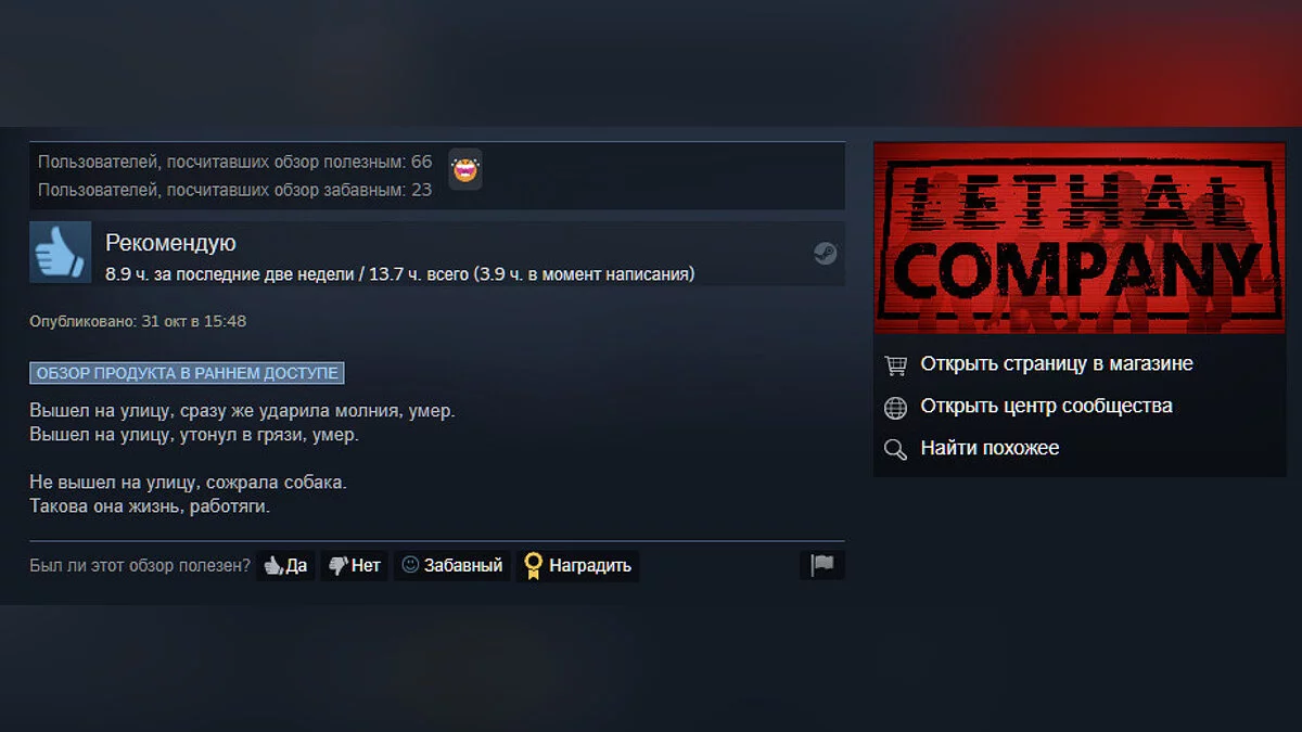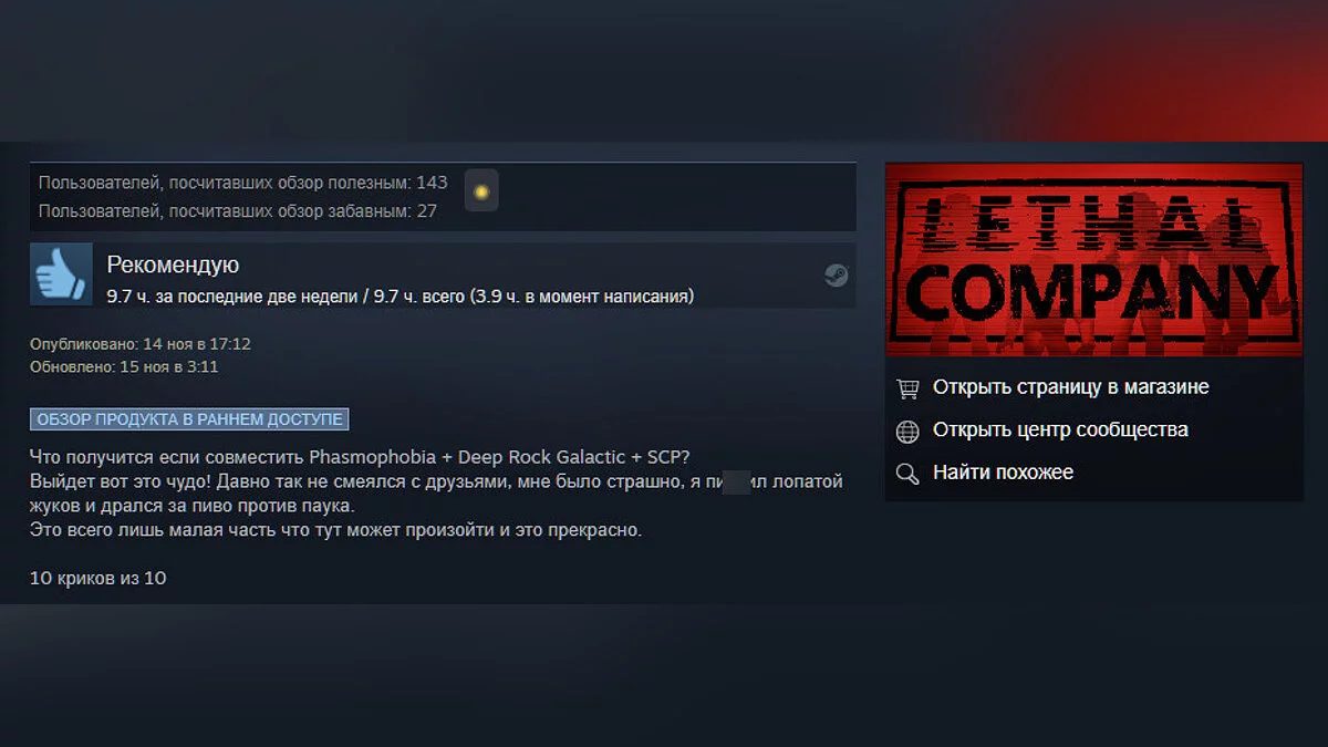 Кооперативный ужастик Lethal Company завирусился в Steam. У него 97% положительных отзывов и свыше 100 тыс человек онлайн
