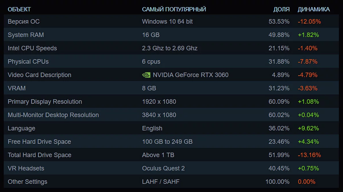 Компания Valve опубликовала свежую статистику по «железу» пользователей сервиса Steam за ноябрь. За последний месяц 11,5% игроков перешли на Windows 11 (64-бит) — почти все они ранее использовали десятую версию ОС. Что касается видеокарт, то самой популярной оказалась NVIDIA GeForce RTX 3060, однако за последние 30 дней количество игроков с ней уменьшилось в 2 раза.
