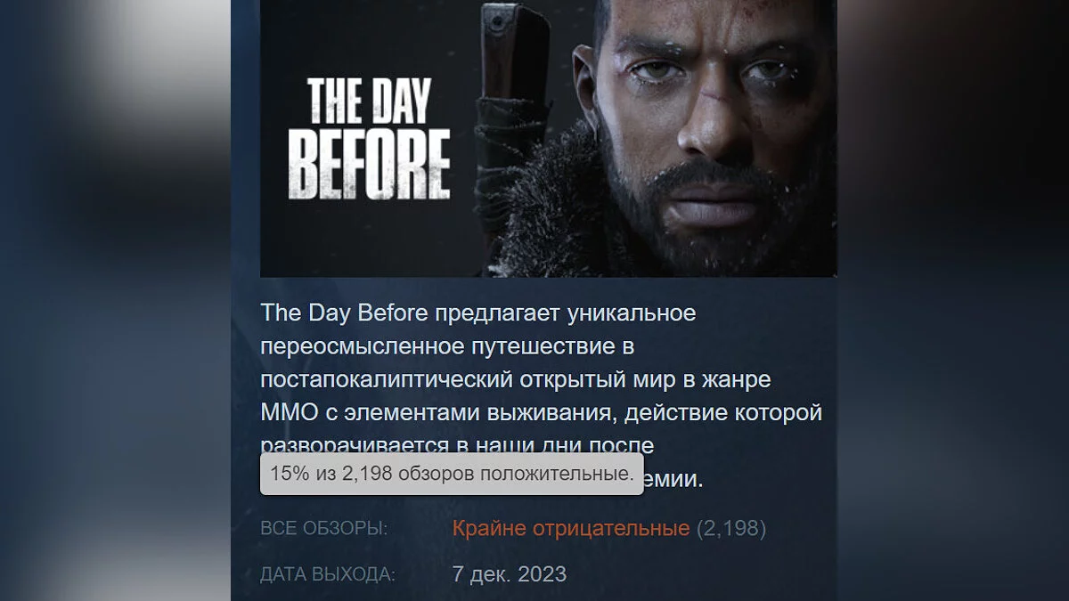 7 декабря в 21:00 (МСК) в раннем доступе Steam состоялся выход The Day Before — российской MMO-выживалки с открытым миром, которая, согласно SteamDB, стала самым ожидаемым проектом декабря в сервисе Valve. Не смотря не переносы, запуск игры оказался крайне проблемным — на момент публикации новости выживалка получила всего 15% положительных отзывов.