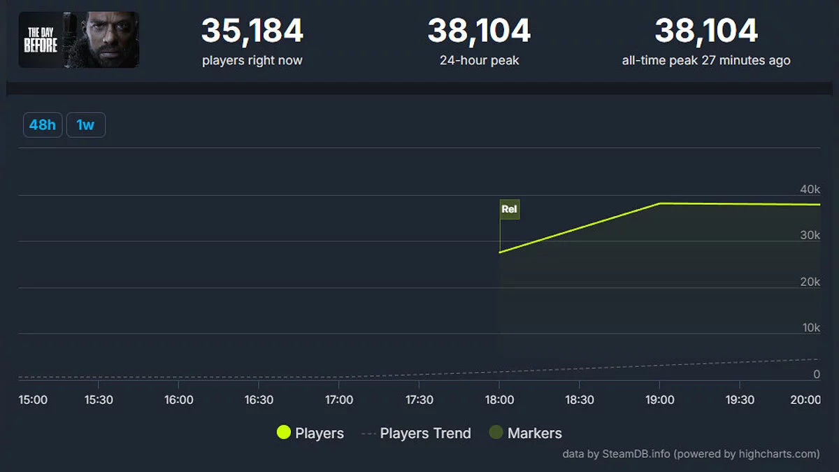 Не смотря на проблемы, The Day Before хорошо стартовала в Steam. В пике онлайна в ней находились 38 тысяч человек. Игра почти догнала Mortal Kombat 1 и в два раза перегнала Lies of P.