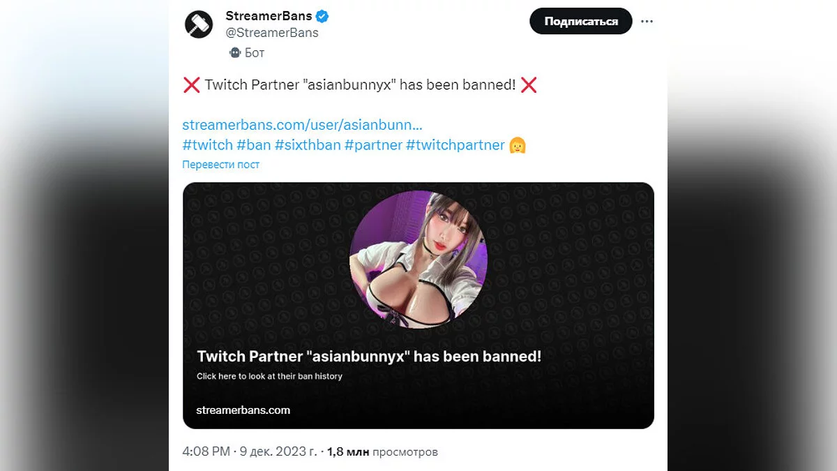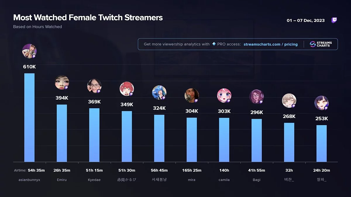 Речь идёт о asianbunnyx, которая стала самой популярной девушкой-стримером первой недели декабря на Twitch. На просмотр её стримов пользователи потратили 610 тысяч часов за 7 дней.