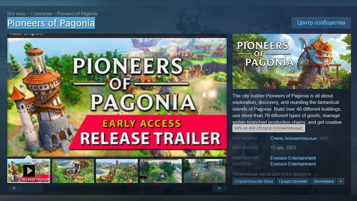 Компания Envision Entertainment выпустила в раннем доступе Steam градостроительный симулятор Pioneers of Pagonia, творческим руководителем которого выступает Фолькер Вертих (Volker Wertich) — создатель оригинальной The Settlers.