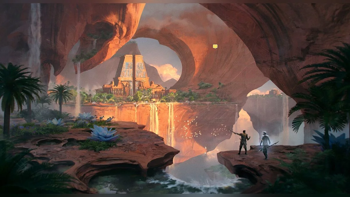 Изображение демонстрирует парящие в небе острова с причудливыми скалами, а также воина в компании призрака. Постройка в центре одного из островов напоминает архитектуру Древнего Египта.