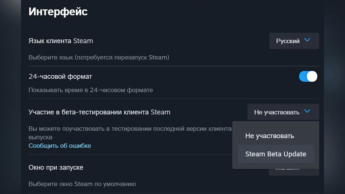 Для того, чтобы загрузить обновление, нужно перейти в настройки Steam, открыть вкладку «Интерфейс» и активировать участие в бета-тестировании клиента.