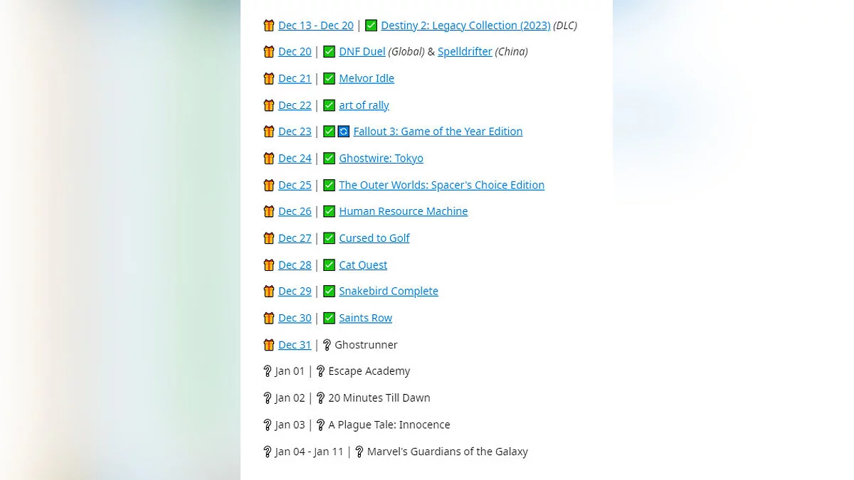 В сети появился возможный список оставшихся игр, которые подарят в рамках праздничной раздачи в Epic Games Store. Если информация верна, то пользователи сервиса смогут забрать в свою библиотеку ещё пять проектов, включая Marvel's Guardians of the Galaxy от создателей серии Deus Ex.