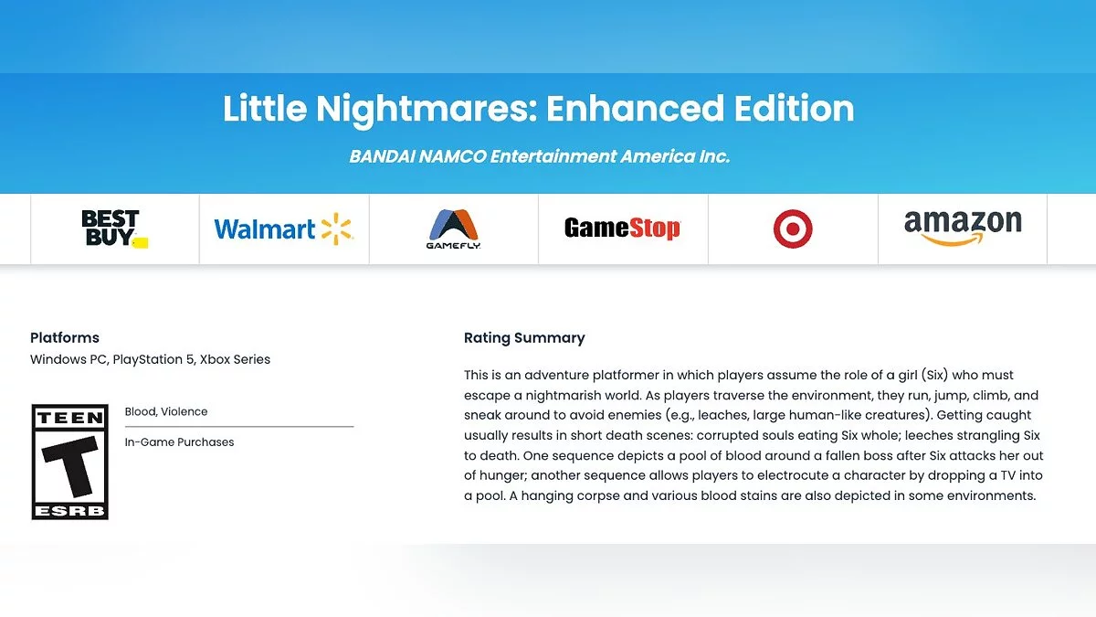 Little Nightmares может получить переиздание для PC, PS5 и Xbox Series X/S. На сайте ESRB засветилось неанонсированное издание Enhanced Edition. О том, чем оно будет отличаться от Complete Edition, которое доступно на новых консолях через обратную совместимость, пока неизвестно.