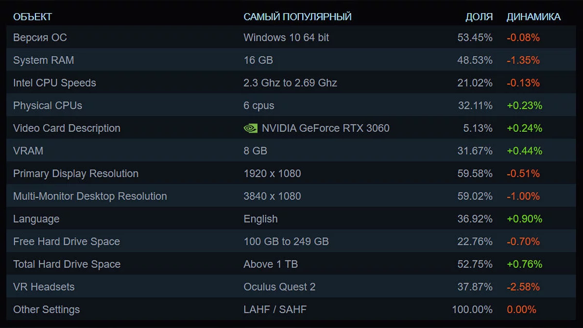 Valve опубликовала список самого популярного «железа» в Steam за декабрь 2023 года. Количество игроков, использующих видеокарту NVIDIA GeForce RTX 3060 и шестиядерный процессор, немного увеличилось, а число геймеров с ОС Windows 10 и 16 Гб ОЗУ незначительно уменишилось.