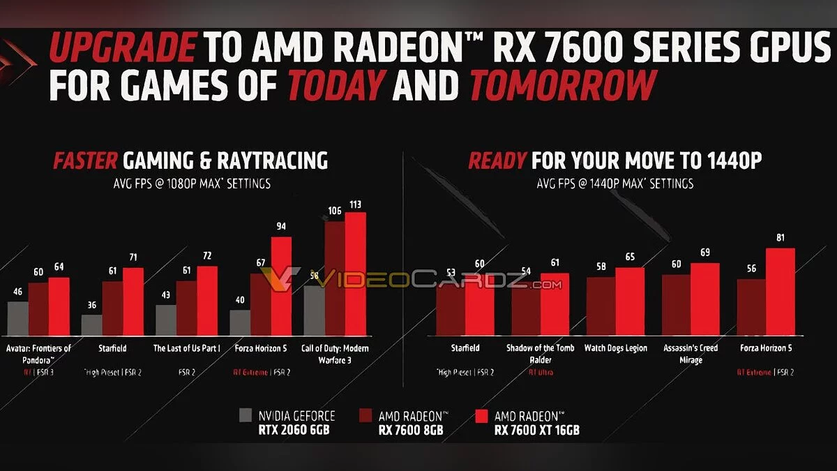 Согласно официальным слайдам, видеокарта рассчитана на игру с разрешениями 1080p и 1440p. Starfield, ремейк The Last of Us: Part 1 и другие игры выдают больше 60 FPS с разрешением Full HD и включенным FSR 2.