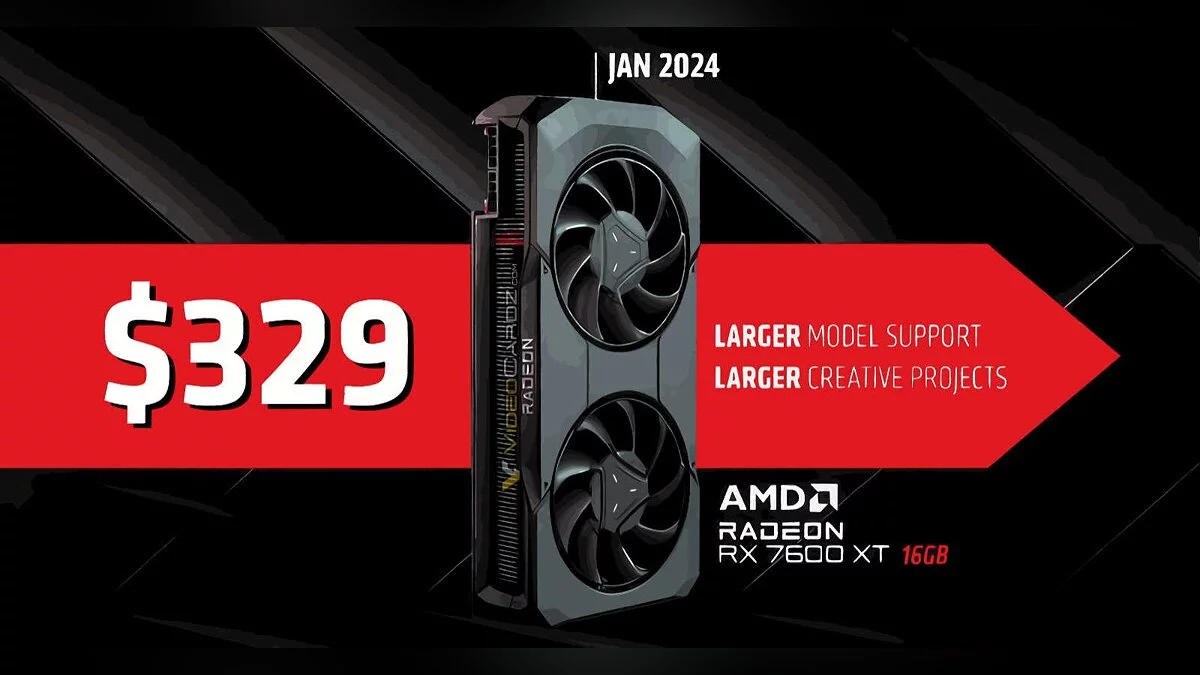 Radeon RX 7600 XT поступит в продажу 24 января. Цена составит $329 (29,9 тысяч рублей).