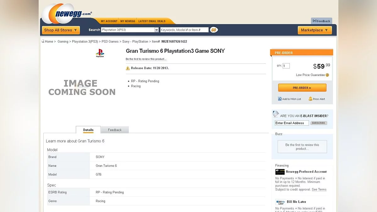В списке доступных для предварительного заказа игр американского розничного магазина Newegg появилась Gran Turismo 6. Информация, указанная на странице игры, полностью соответствует предыдущим слухам.