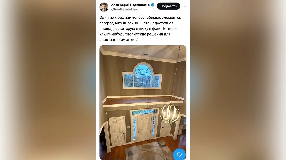 В соцсети X (Twitter) завирусился новый мем. Пользователь с ником RealEstateMaxi опубликовал фотографию с пустым местом в доме и попросил подписчиков накидать идей, чем его заполнить. Пост собрал почти 100 миллион просмотров, 12 тысяч репостов и 2 тысячи комментариев.
