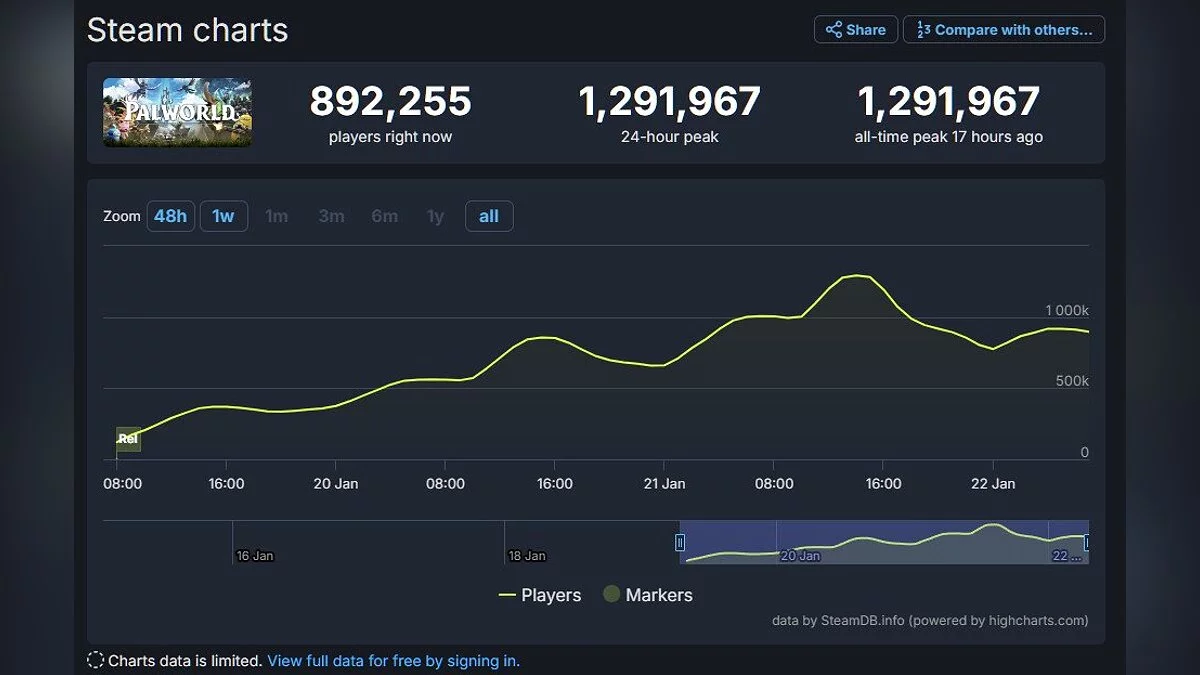Мир продолжает сходить с ума по «покемонам с пушками» Palworld. Еще вчера мы писали, что пиковый онлайн перевалил за миллион игроков, как он вырос еще сильнее.