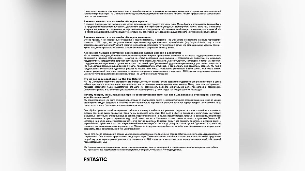 Все последние новости команда назвала враньем. По словам Fntastic, у нее прекрасные отношения с инвесторами и разработчиками. В заявлении сказано, что сотрудникам активно помогали с релокацией, медицинскими услугами и даже ипотекой. Также студия добавила, что увольнений было очень мало, а половина отстраненных работников возвращались обратно.