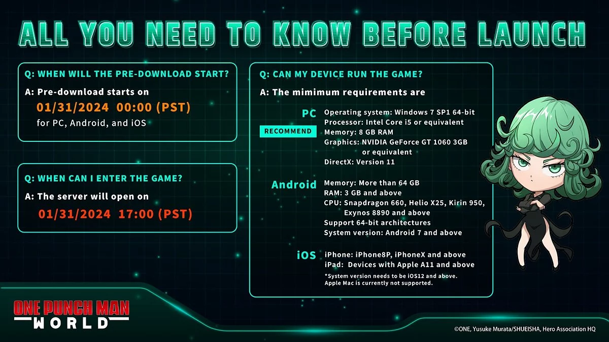 Авторы условно-бесплатного мобильного гача-экшена One Punch Man: World опубликовали системные требования и новый трейлер игры, где продемонстрировали разных играбельных персонажей.