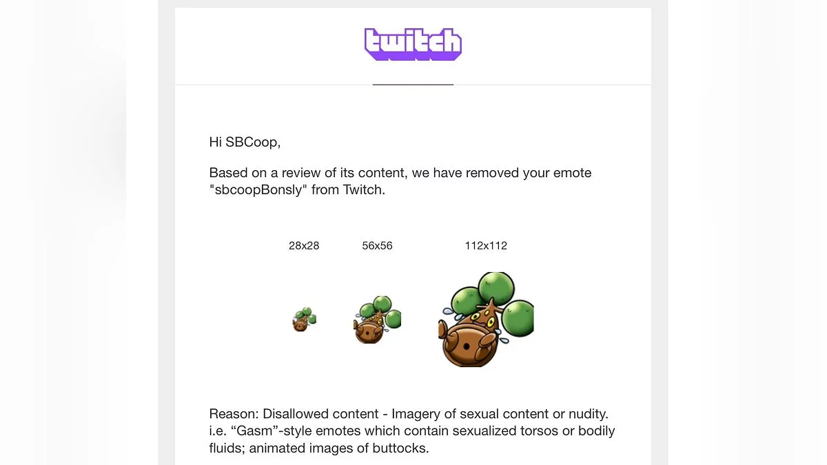 Ниже можно увидеть письмо, где представители Twitch объяснили причину блокировки. Судя по всему, модераторов смутило отверстие в теле покемона, которое приняли за кое-что другое.