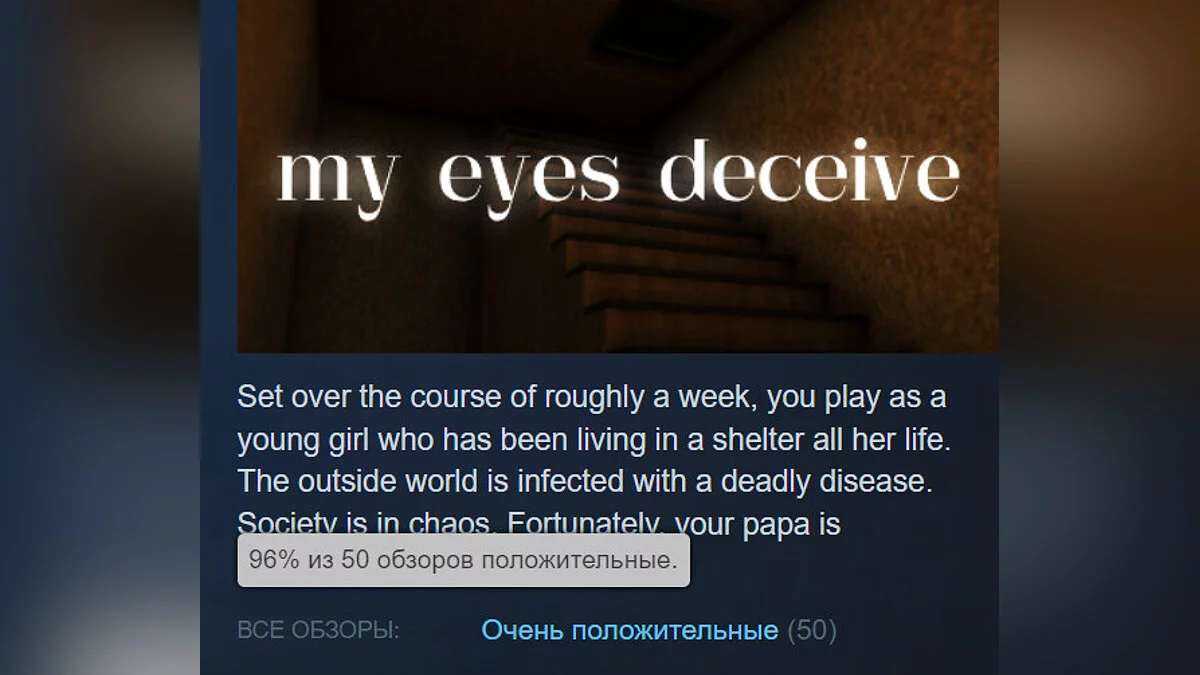 my eyes deceive — атмосферный психологический хоррор от первого лица про молодую девушку из приюта с ретро-графикой в духе проектов для первой PlayStation. Игра довольно короткая — проходится всего за 30-45 минут. Имеет 96% положительных отзывов. Страница в Steam.