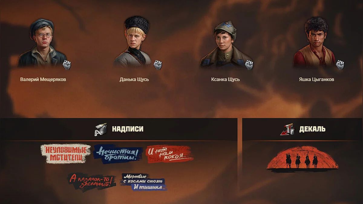 Также в игре появились легендарные фразы героев (в виде надписей): «Нечистая, братцы!», «И нет нам покоя...», «А казачок-то засланный!» и «Мёртвые с косами стоят. И тишина...». Наборы с ними продаются за золото, кредиты и свободный опыт. Кроме того, геймерам стал доступен скин «Красный эскадрон», созданный в сотрудничестве с «Мосфильмом».