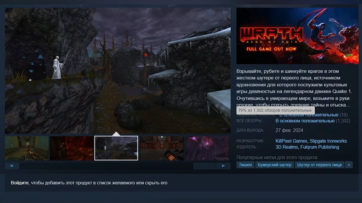 Компания-издатель 3D Realms сообщила о выходе релизной версии (1.0) олдскульного шутера от первого лица WRATH: Aeon of Ruin, который с 2019 года находился в раннем доступе. За это время проект получил рейтинг 76% в Steam.