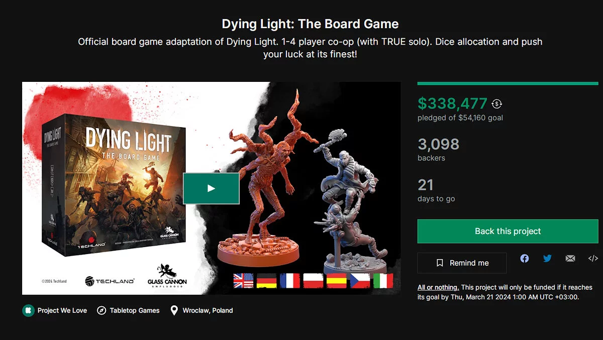 Techland, авторы Dying Light, запустили кампанию по сбору средств на настольную версию своей игры. Они уже собрали нужную сумму (54160 долларов), хотя до окончания кампании осталось ещё три недели.