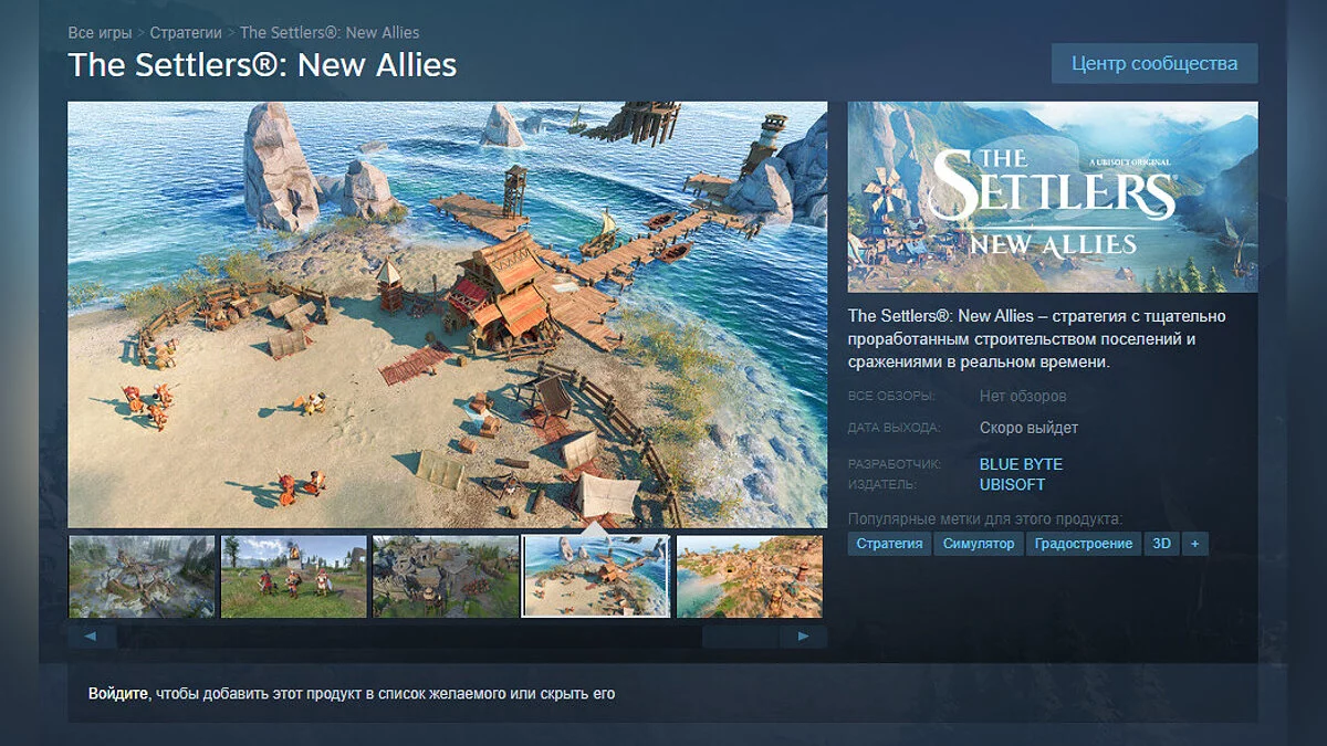 PC-версия градостроительной стратегии в реальном времени The Settlers: New Allies, которая сейчас доступна только в Epic Games Store и Ubisoft Store, выйдет в Steam. В сервисе уже появилась страница игры, но пока без даты выхода. Сейчас проект можно добавить в список желаемого.