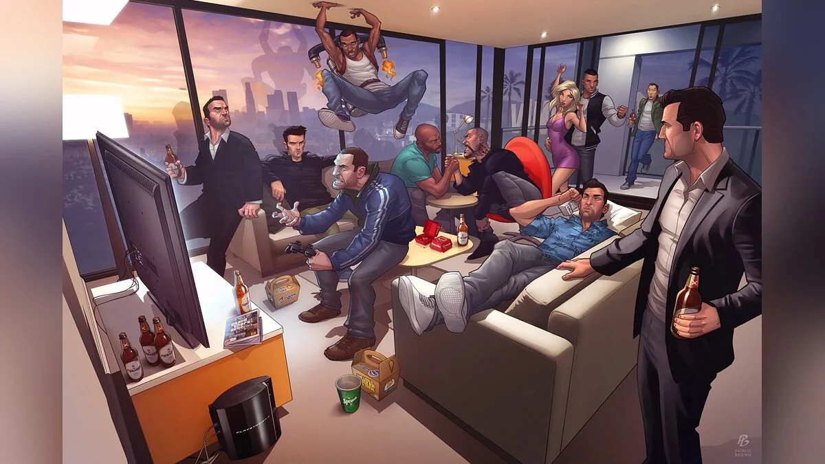 Художник Патрик Браун (Patrick Brown), работающий в компании Marvel, опубликовал арт, на котором объединил главных героев GTA 4 (Нико Беллика), GTA 5 (Майкла Де Санты, Фрaнклина Клинтона и Тревора Филипса) и GTA 6 (Люсии и Джейсона).