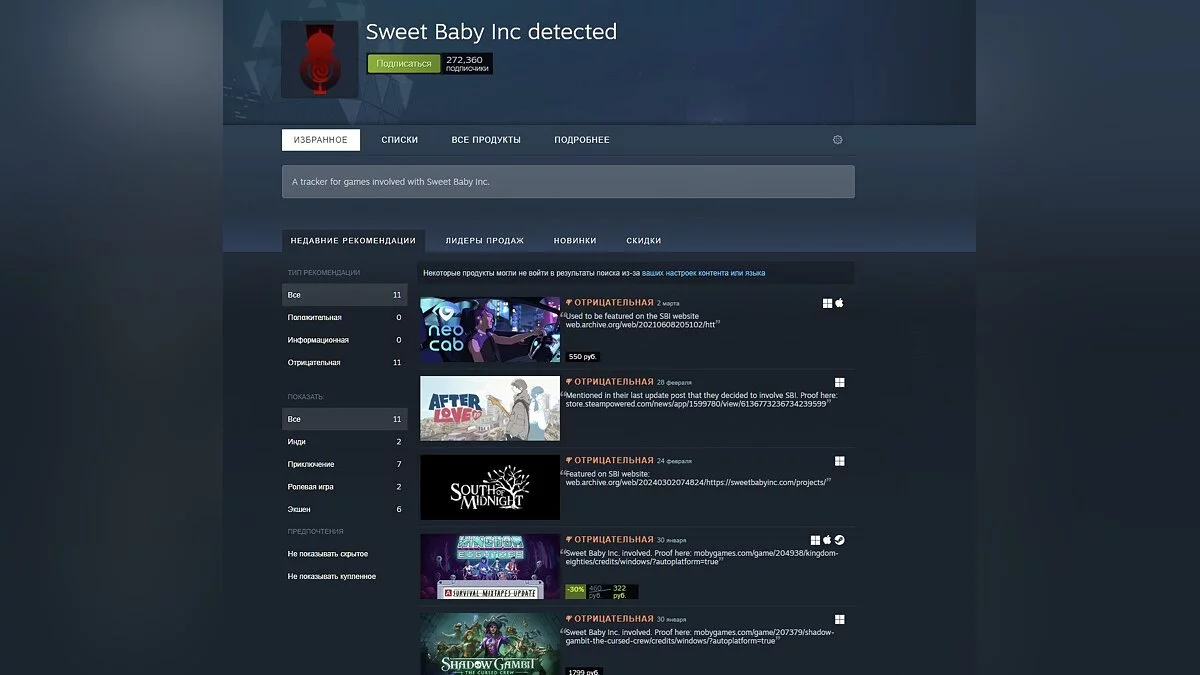 На фоне популярности в Steam появилась кураторская группа с названием Sweet Baby Inc detected, на странице которой отмечены игры, к которым приложила руку Sweet Baby Inc. Представители компании попытались «отменить» группу, призвав других пользователей жаловаться Valve. В конечном счете аудитория куратора выросла с 1200 до 270 000 подписчиков.