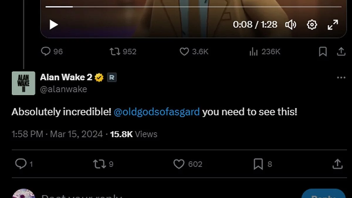 В ответ на пост с видеороликом аккаунт Alan Wake 2 опубликовал запись: «Абсолютно невероятно! @oldgodsofasgard, вы должны это увидеть!».