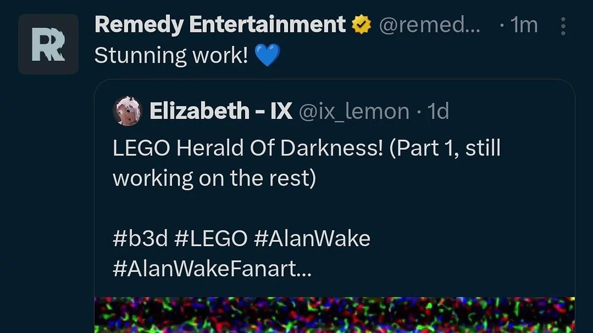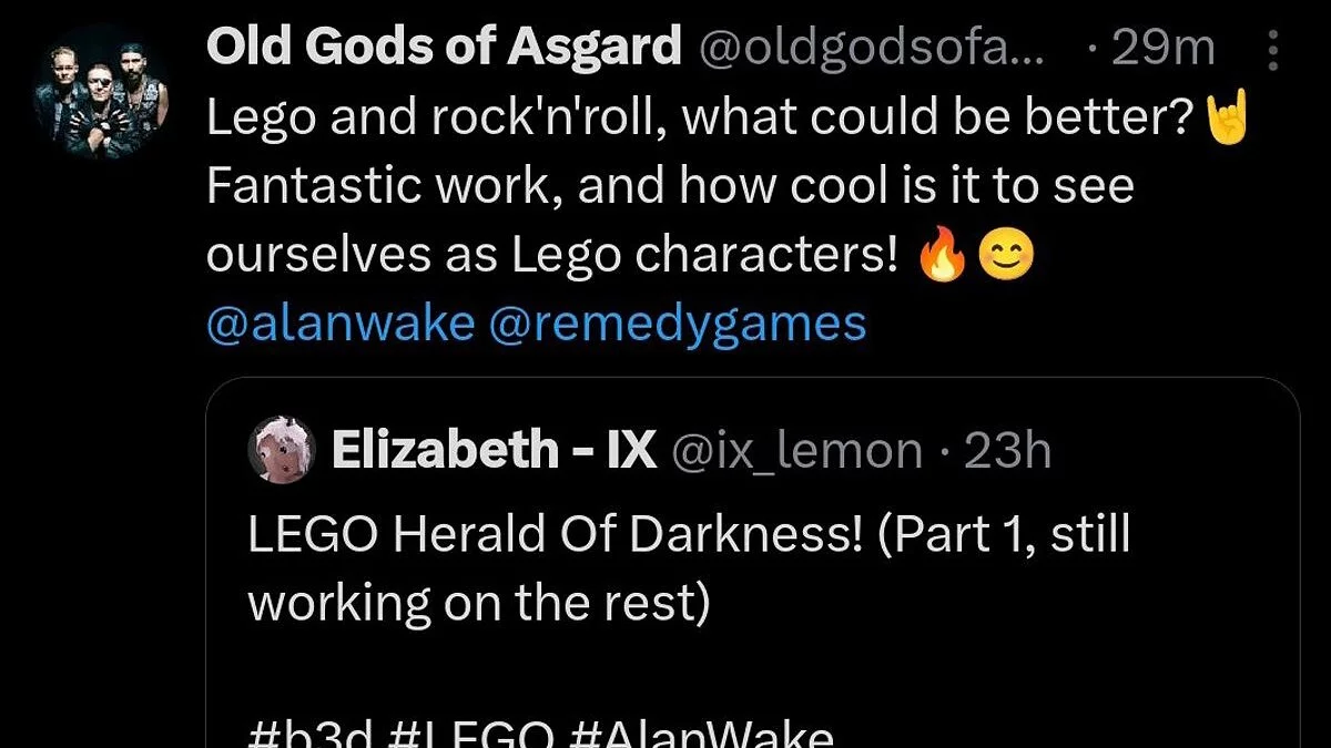 Художница по спецэффектам под ником Elizabeth — IX опубликовала в соцсетях свое видение клипа Herald of Darkness из игры Alan Wake 2, стилизовав его под LEGO. Работу уже оценили Remedy и Old Gods of Asgard (Poets of the Fall).