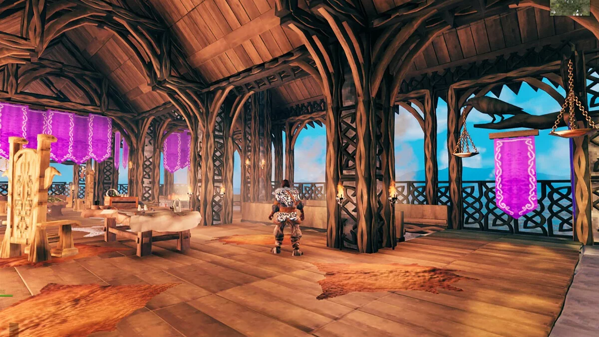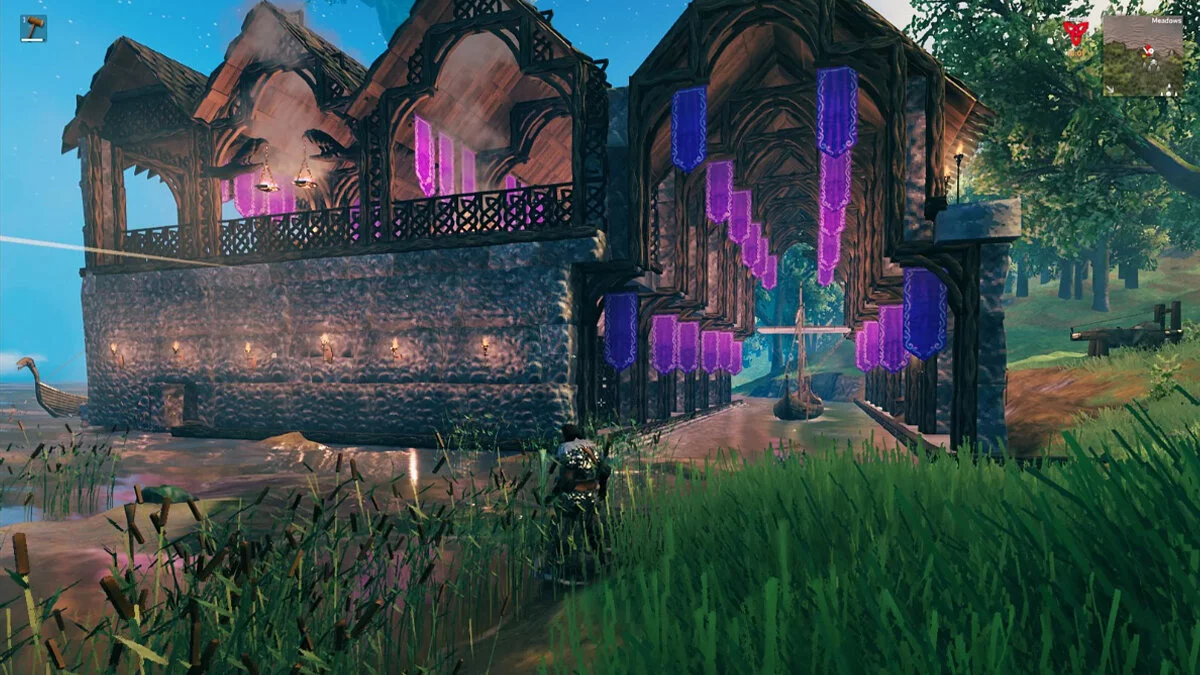 Один из пользователей Reddit поделился скриншотами базы в Valheim, которую построила его девушка. Здесь есть все: причал для корабля, арки, галерея и уютная спальня.
