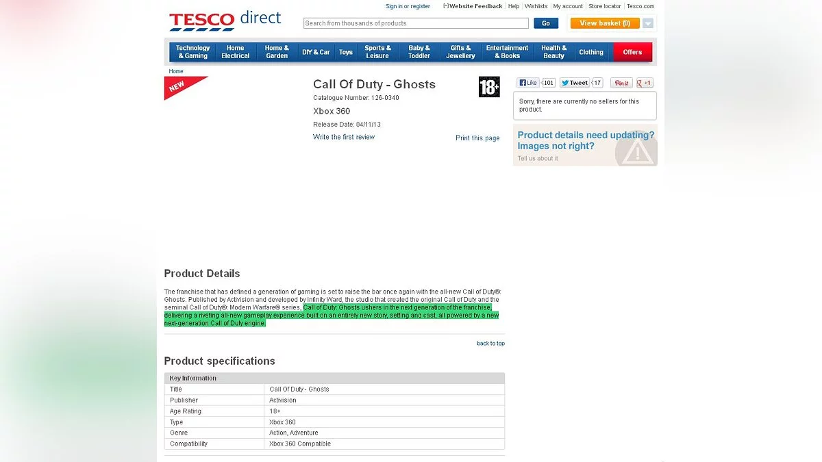 Судя по описанию Call of Duty: Ghosts, замеченному на сайте британской торговой сети Tesco, игра работает на совершенно новом движке и ей занимается Infinity Ward.