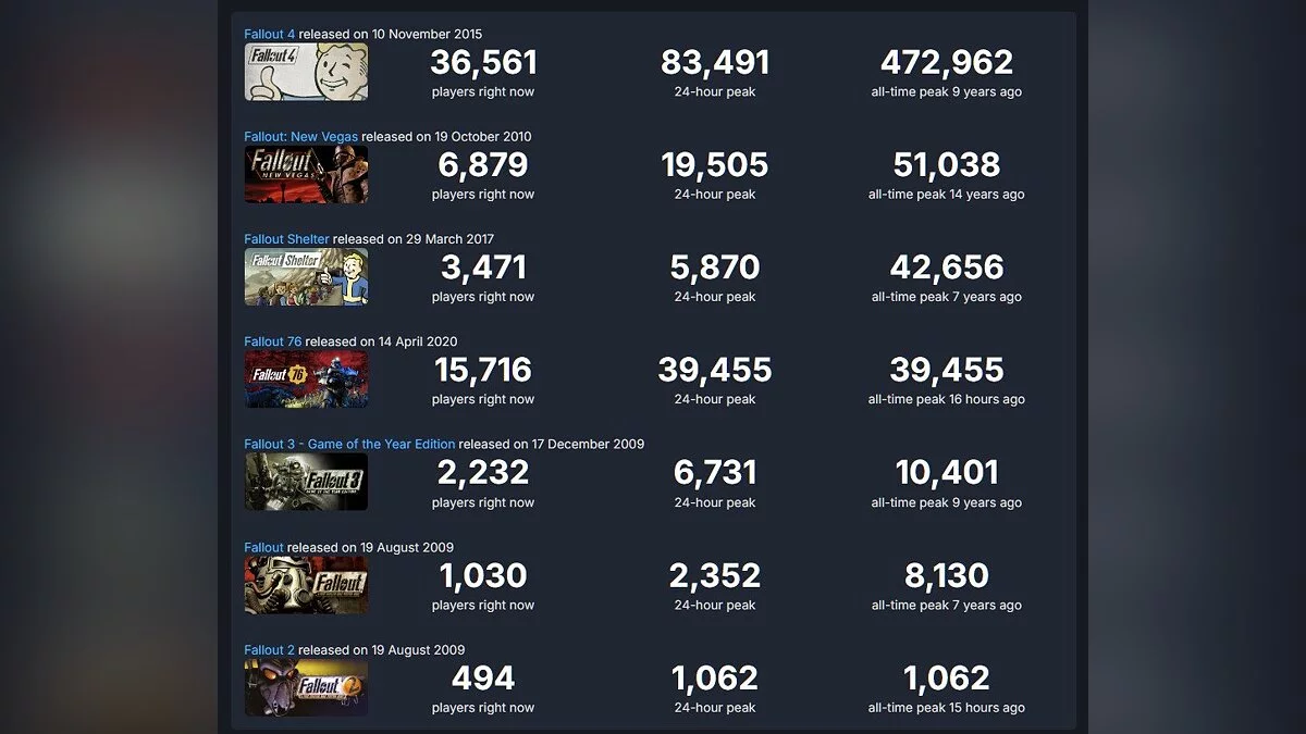 Примечательно, что двум играм — Fallout 76 и Fallout 2 — даже удалось обновить рекордный онлайн в Steam.