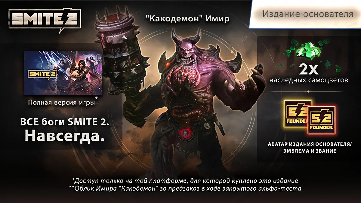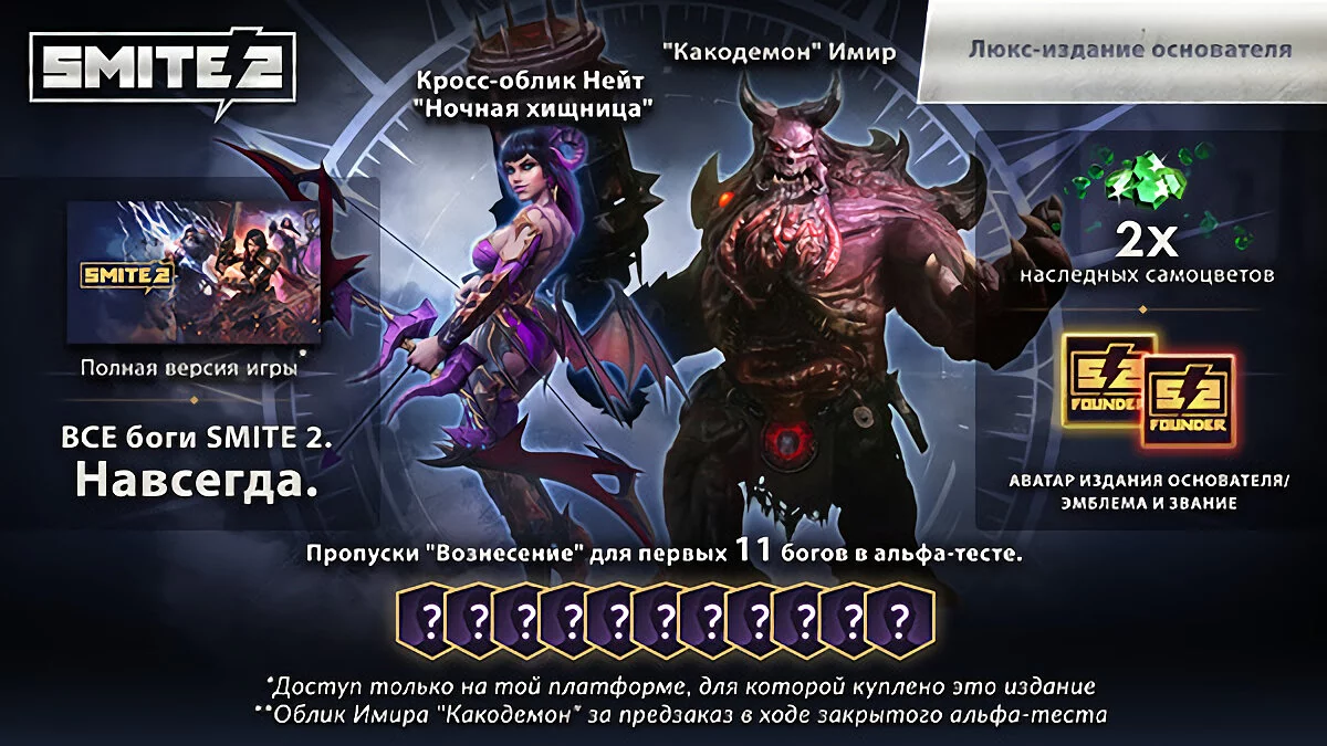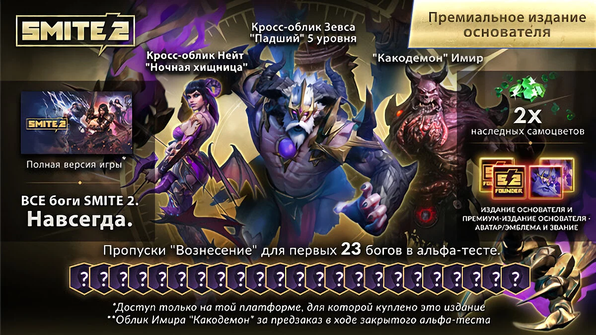 В стандартную версию издания за 2759 рублей (цена в российском Steam) входят все боги (навсегда), скин «Какодемон» для Имира, уникальные аватар, эмблема и звание, а также удвоенное количество наследных самоцветов. Покупатели люкс-версии за 5519 рублей дополнительно получат скин «Ночная охотница» для Нейт и пропуски «Вознесение» для первых 11 богов в альфа-тесте. В состав премиальной версии за 9199 рублей входят все бонусы из более дешёвых версий, а также скин «Падший» для Зевса и пропуски «Вознесение» для первых 23 богов.