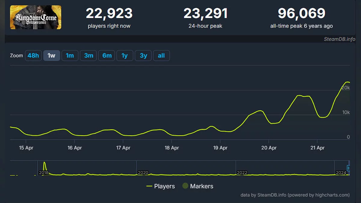Анонс Kingdom Come: Deliverance 2 вернул игрокам интерес к первой части — в Steam «онлайн» RPG поднялся примерно в 4 раза. 21 апреля в игре находились одновременно 23 тыс человек (ранее «онлайн» не превышал 6 тыс игроков). Поднять показатель также помогла скидка 80%.