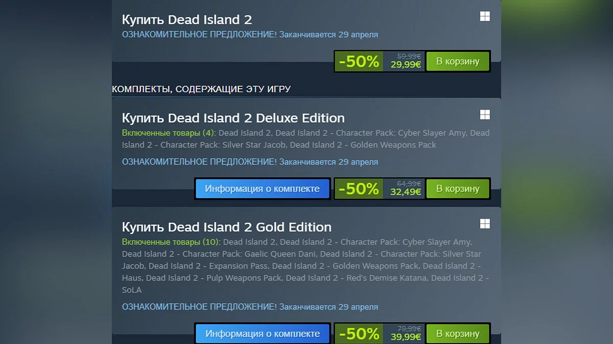 ПК-версия зомби-экшена Dead Island 2 появилась в Steam. Ранее она была доступна только в сервисе Epic Games Store. До 29 апреля игру отдают со скидкой 50%. В России она не продаётся.