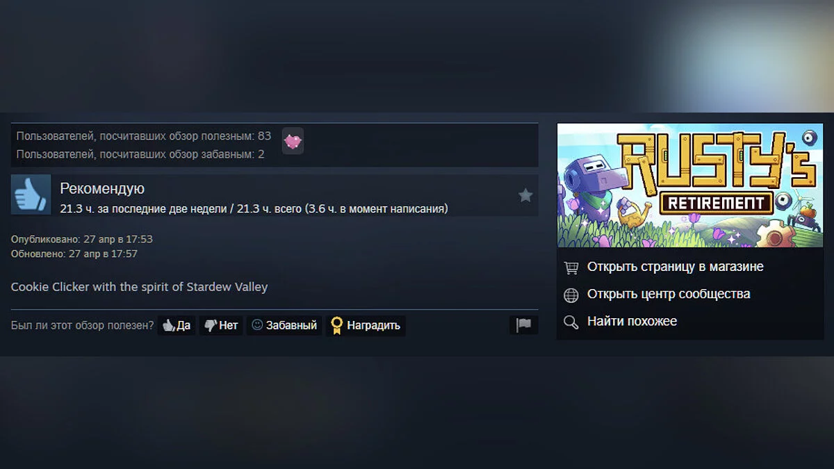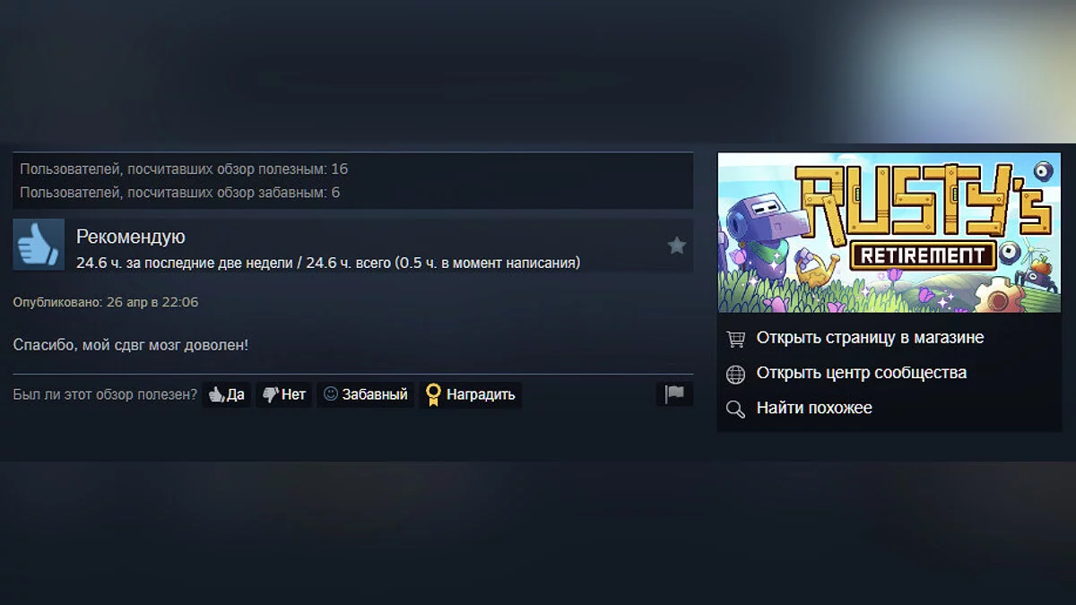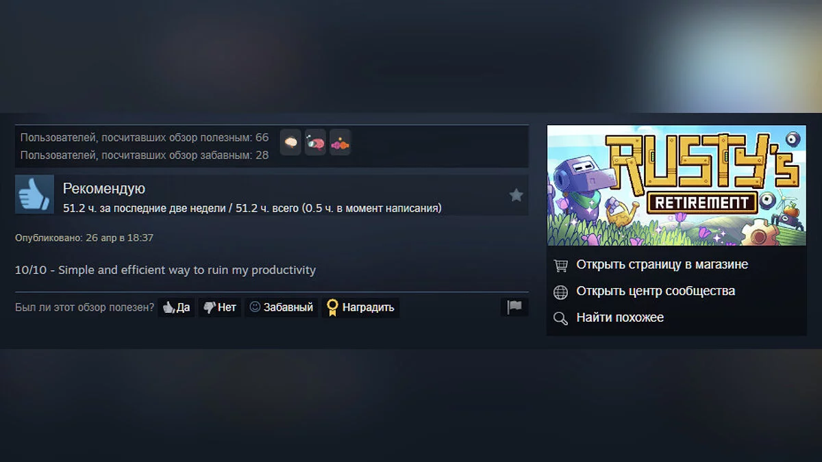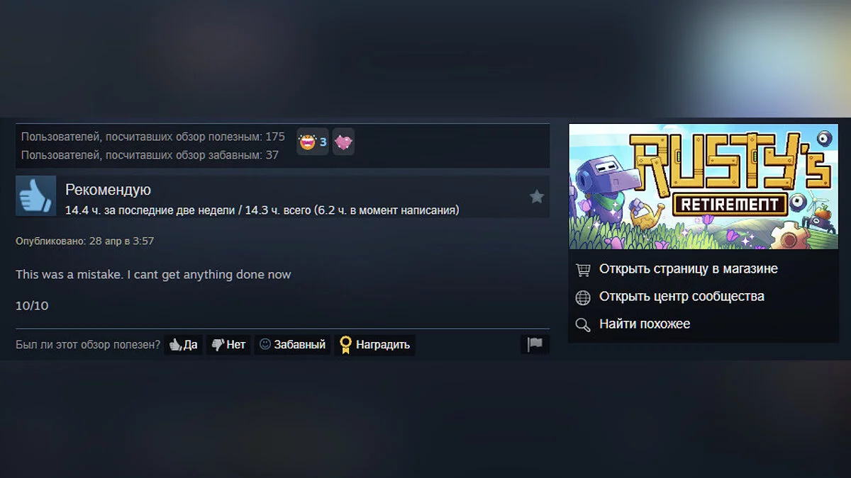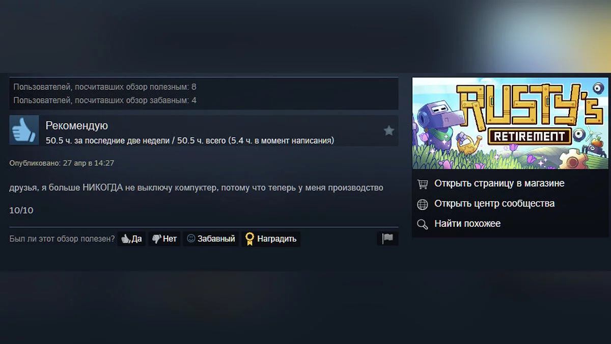 На момент написания заметки Rusty's Retirement входит в число самых трендовых игр в Steam. Онлайн составляет 17 тысяч человек, а рейтинг — 97% на основе 1965 ревью.