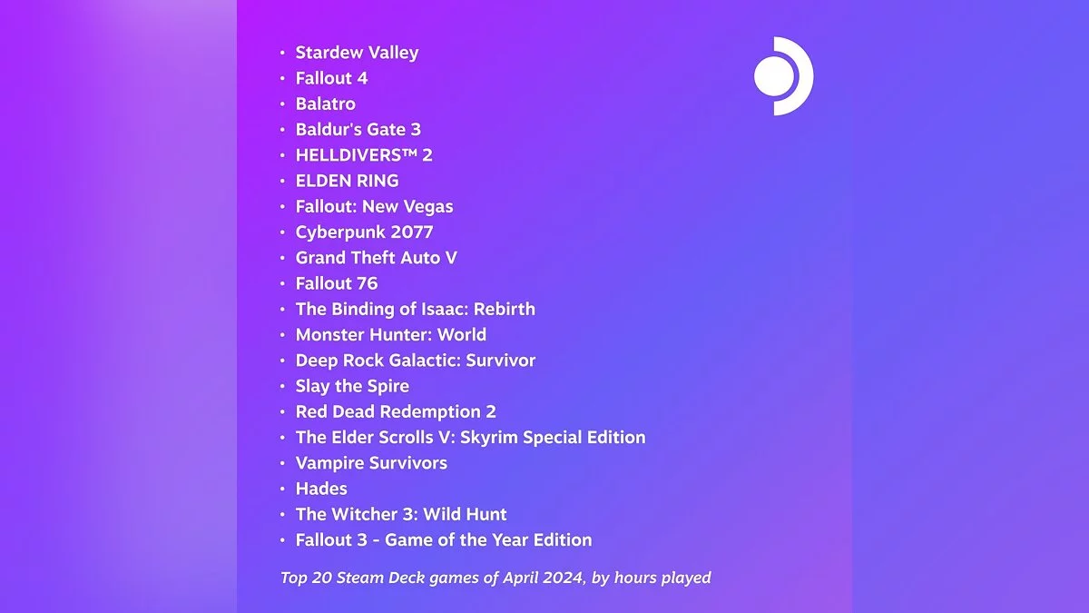 Valve опубликовала свежий чарт самых популярных игр апреля для Steam Deck. Любопытно, что в топ попали все трехмерные части Fallout.