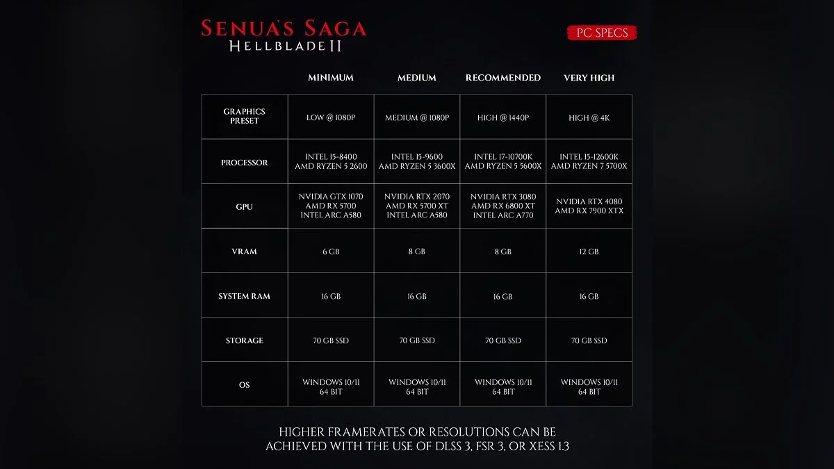Студия Ninja Theory опубликовала подробные системные требования Senua's Saga: Hellblade 2. Для запуска игры в 1080p потребуются как минимум Windows 10, Intel i5-8400, 16 Гб ОЗУ и GTX 1070.